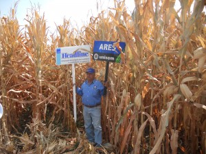 El terreno del Sr. Fructuoso se divide en dos partes separadas por un arroyo. En la parte mayor y más plana, del otro lado del arroyo, se ubicó la comparación de materiales de Unisem, Midas, Ares, Eros, y Perseo. Además, se evaluó el fungicida Headline de BASF, aplicado antes de floración a unos surcos de Midas y otros de Ares. Esa parte del terreno es algo reseca y resintió mucho la falta de lluvia que empezó el 15 de agosto. La parte entre la carretera y el arroyo, en contraste, recibe agua del cerro y estaba sembrada en su totalidad con un solo híbrido, Ares.